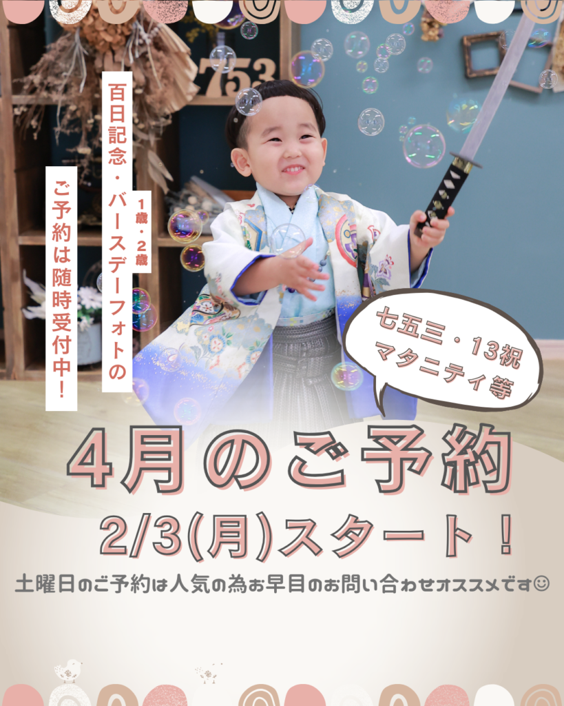 📍4月予約開始のご案内📍 沖縄県うるま市石川にある子ども写真館フォトスタジオスウィート