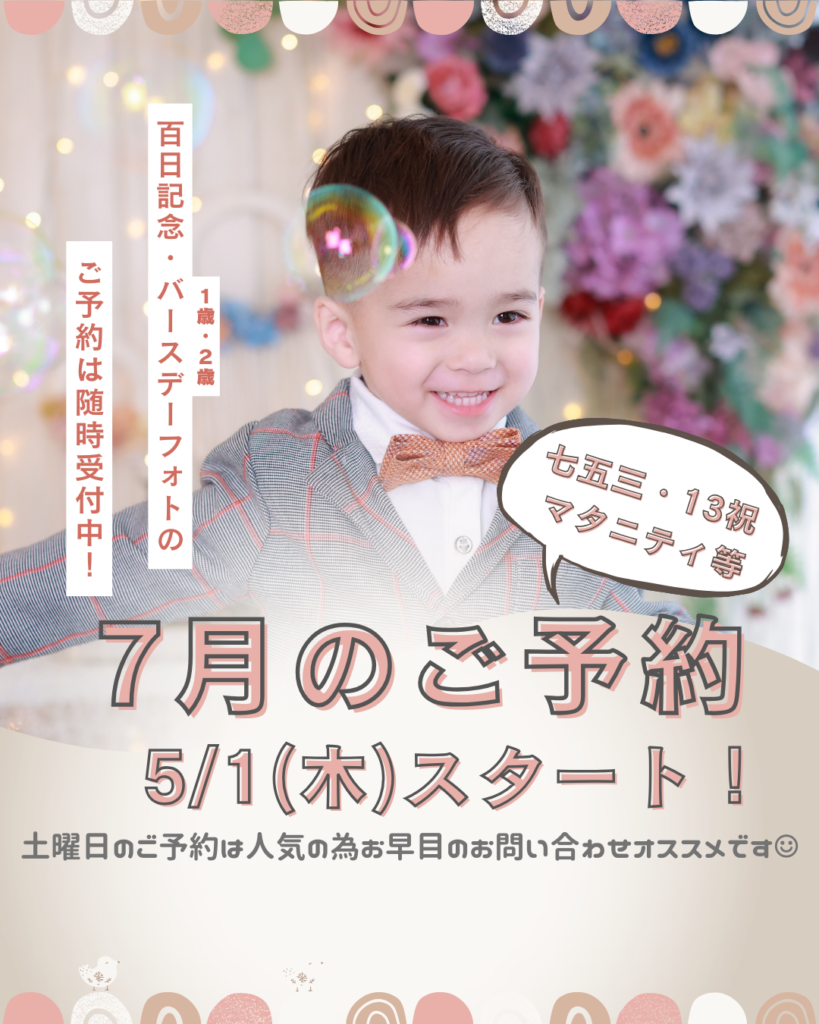 📌7月予約開始のご案内📌                                                                        沖縄県うるま市石川にある子ども写真館フォトスタジオスウィート